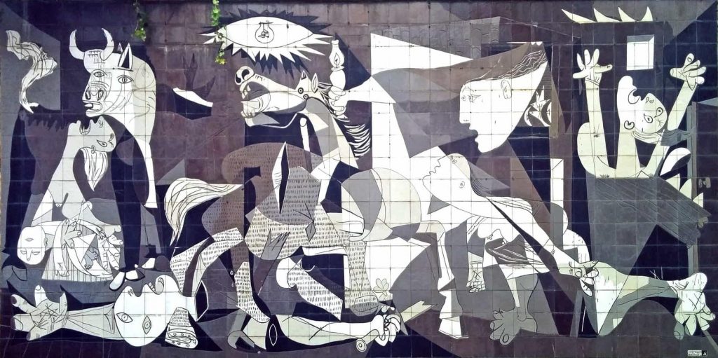 The painting depicts the terrible aerial bombing of the town of Guernica in the Basque region during the Spanish Civil War.